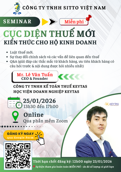 Nhằm hỗ trợ các hộ kinh doanh hiểu đúng – làm đúng, giảm tránh rủi ro liên quan về thuế, Công ty Sitto Việt Nam tổ chức seminar online HOÀN TOÀN MIỄN PHÍ với nội dung tập trung vào những thay đổi mới nhất trong chính sách thuế.