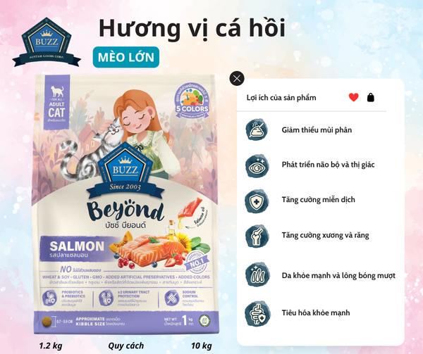Beyond – Gluten-free: Đa dạng hương vị dành cho mèo như cá hồi, cá ngừ, cá thu, cừu và Mother & Baby Cat (cá ngừ – cá hồi – sữa), hỗ trợ tiêu hóa, miễn dịch, não bộ, xương răng và sức khỏe da lông.
